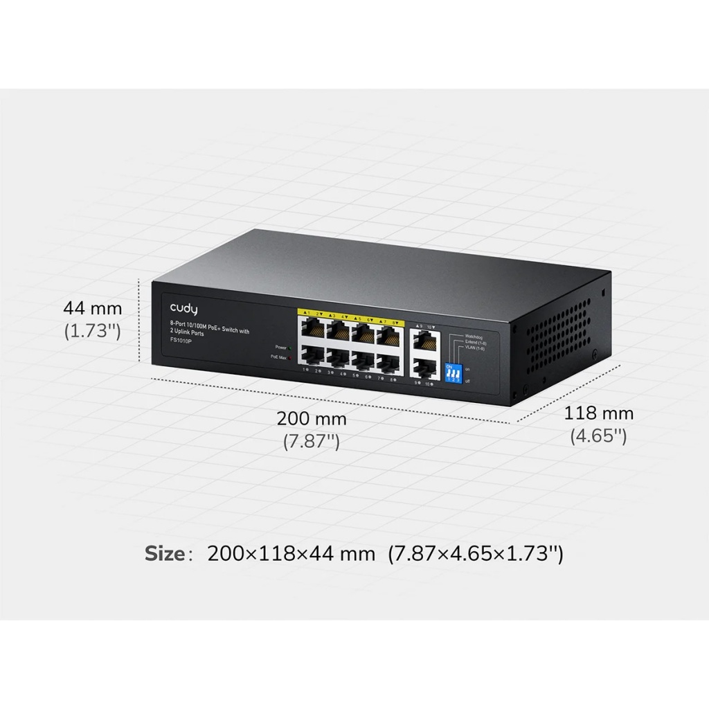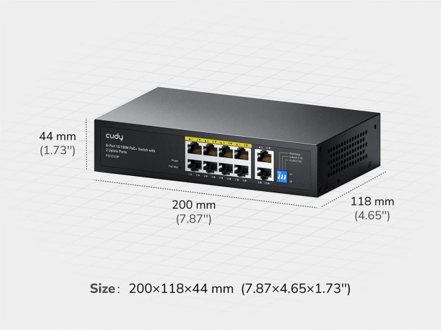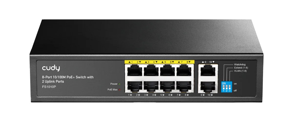 - Puertos: 8 puertos 10/100 Mbps PoE+ y 2 puertos Uplink.